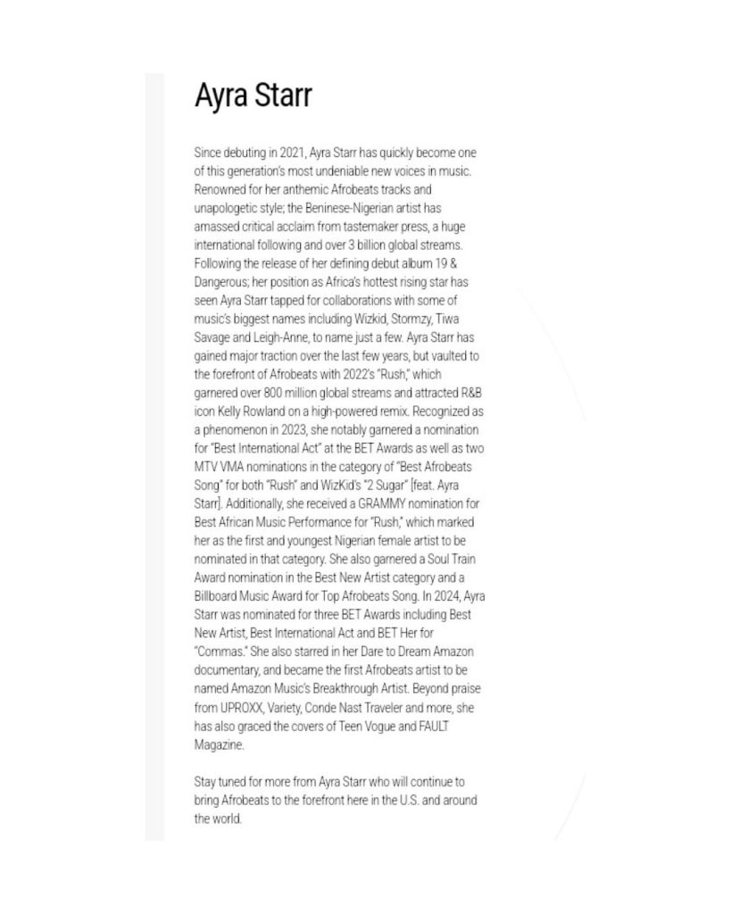 Nigerian pop star Ayra Starr has officially entered a partnership with the Roc Nation family. Ayra Starr now appears on the management page of Roc Nation’s official website, signalling what appears to be a strategic new phase in her global ascent.